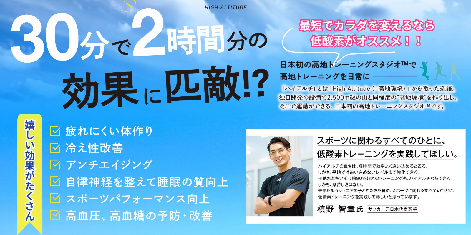 高地は平地に比べて酸素濃度が低いため、高地環境にいるだけで人のカラダに負荷がかかります。すると人のカラダは効率よく酸素を取り込めるようになるので、心肺機能や持久力が向上。乳酸の増加も抑制するので、疲れにくいカラダづくりにつながります。